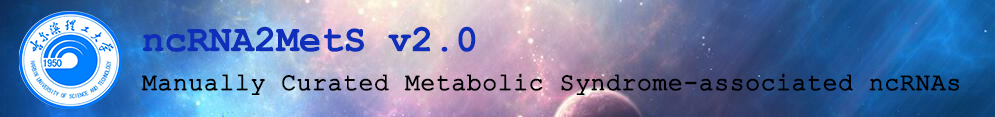 This database aims to collect the manually curated associations between metabolic syndrome and non-coding RNA (microRNA, lncRNA and circRNA). In the current release, this database provides 1505 associations between 1289 miRNAs, 200 lncRNAs and 16 circRNAs and metabolic syndrome and its characteristic diseases (abdominal obesity, type 2 diabetes mellitus, hypertension, hypertriglyceridemia and reduced high-density lipoprotein cholesterol) across 6 species from more than 4000 published articles.