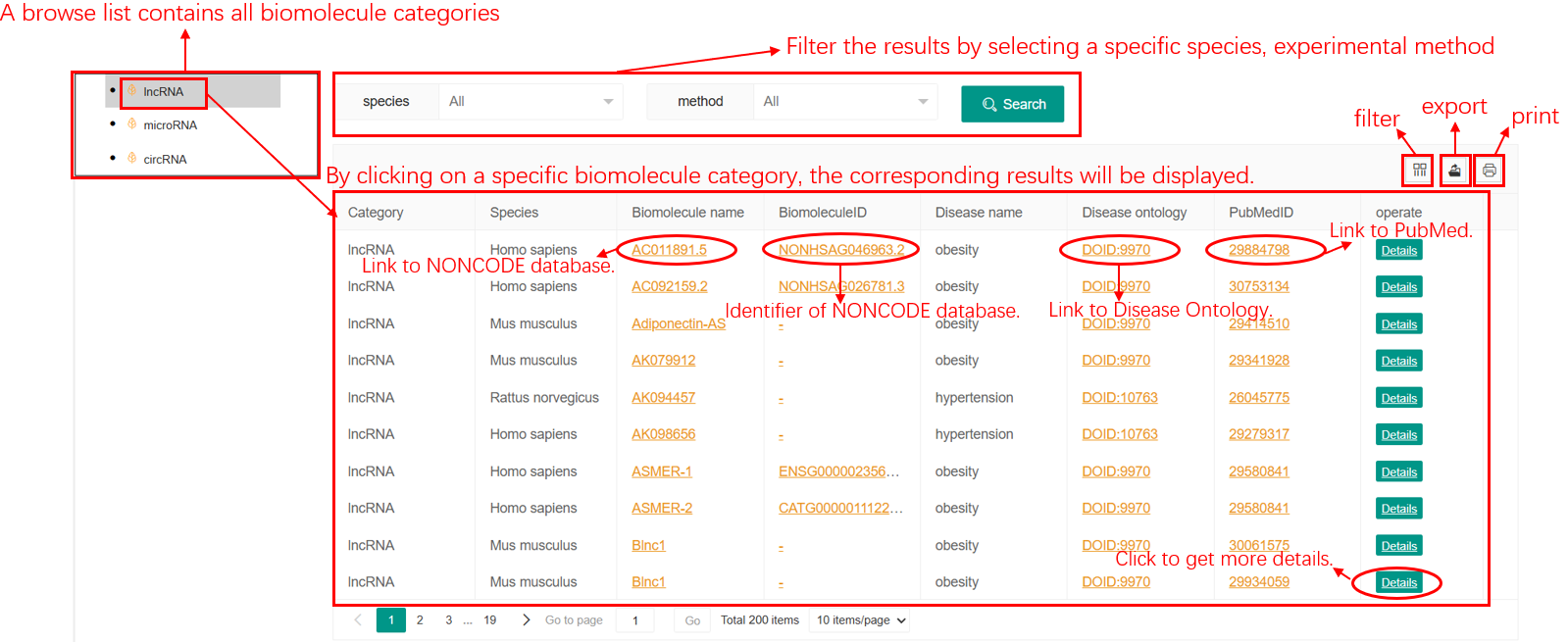 In the Browse page, users can browse the metabolic syndrome-ncRNAs associations by clicking a specific metabolic syndrome trait, microRNA, lncRNA or circRNA. Then, users can filter the results by selecting a specific ncRNA category, species, experimental method, and a corresponding results table will display.