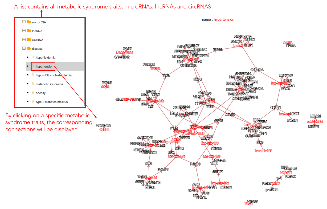 This database is a comprehensive database that provides manually curated associations between metabolic syndrome and non-coding RNAs, including microRNAs, lncRNAs and circRNAs. In the current release, this database provides 1505 manually curated associations between 1289 miRNAs, 200 lncRNAs, and 16 circRNAs and metabolic syndrome traits, including abdominal obesity, type 2 diabetes mellitus, hypertension, hyperlipi-daemia and hypolipoproteinaemia across 6 species from more than 4000 published literatures.