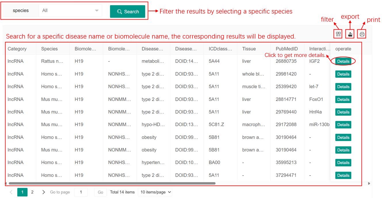 There is a data table shows when users initiate a search request. Each entry contains the information about ncRNAs (microRNA, lncRNA or circRNA), metabolic syndrome traits and their relationships, including ncRNA category, Species, ncRNA name, disease name, PubMed ID and details. Users can click on the "Download Search Result" button to download the data table and the "details" button to view a comprehensive information about this entry.