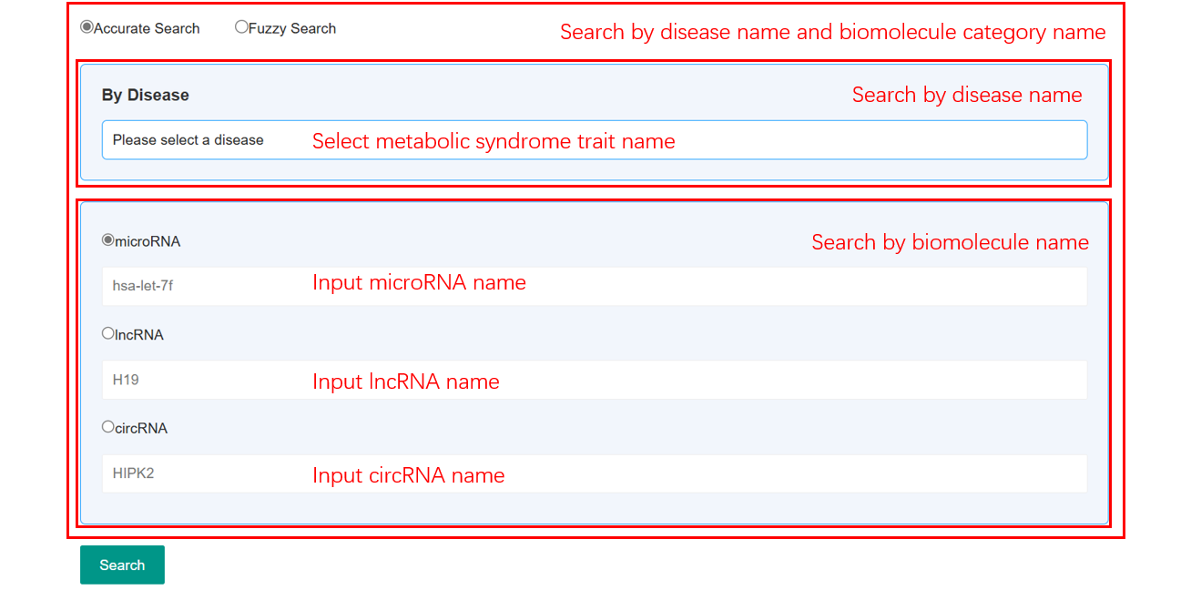 In the Search page, users can search by a specific metabolic syndrome trait name or a microRNA, lncRNA or circRNA name. Users can also search by inputting both metabolic syndrome trait name and a microRNA, lncRNA or circRNA name. ncRNA2MEtS 2.0 provides an option in the search page that enables users to filter associations by specific experimental methods. ncRNA2MetS 2.0 offers a fuzzy search function for the entries by the full or partial names of ncRNAs and/or metabolic syndrome trait.